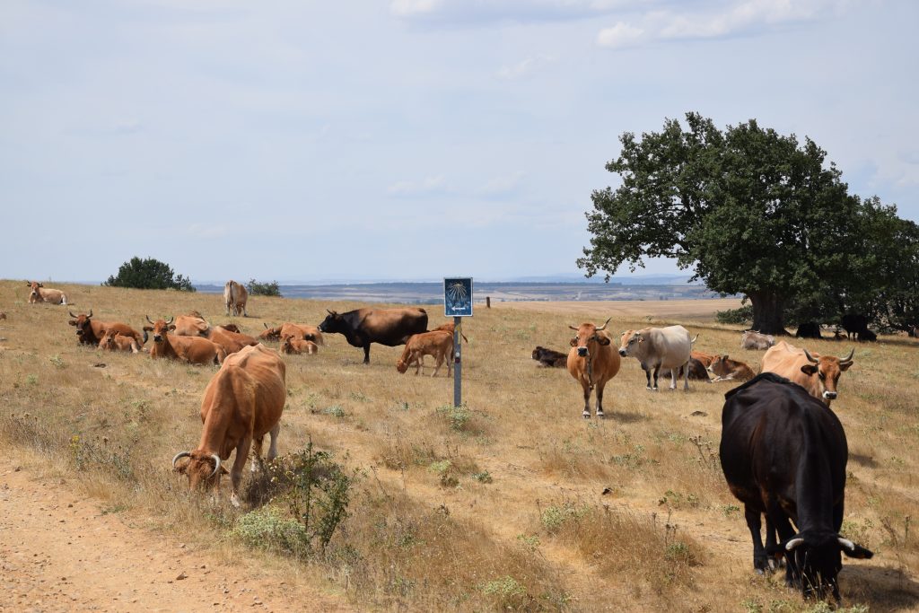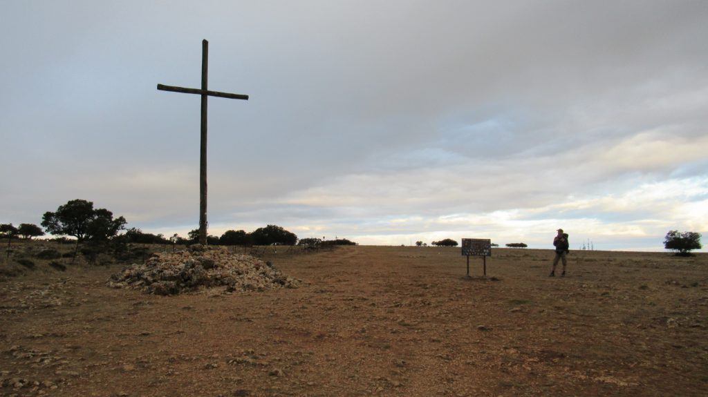 Abandonas San Juan de Ortega y subes suavemente hasta la “Cruz de Madera”, donde una simple cruz de madera se alza al viento. Desde aquí se abre el paisaje: Castilla se extiende ante ti, amplia y llana, el cielo grande y despejado.